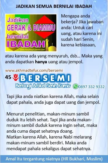 Sebuah ide yang luar biasa. Menjalankan ide ini berarti kita tidak pernah kehilangan waktu satu detik pun. Semua waktu akan bernilai ibadah. Bahkan diam kita dan tidur kita. Yuk kita share Bersemi edisi 45 ini ke kerabat dan sahabat…